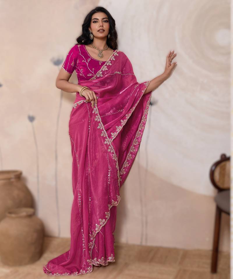 | • | Saree | : | Color- Pink / Fabric- Satin |