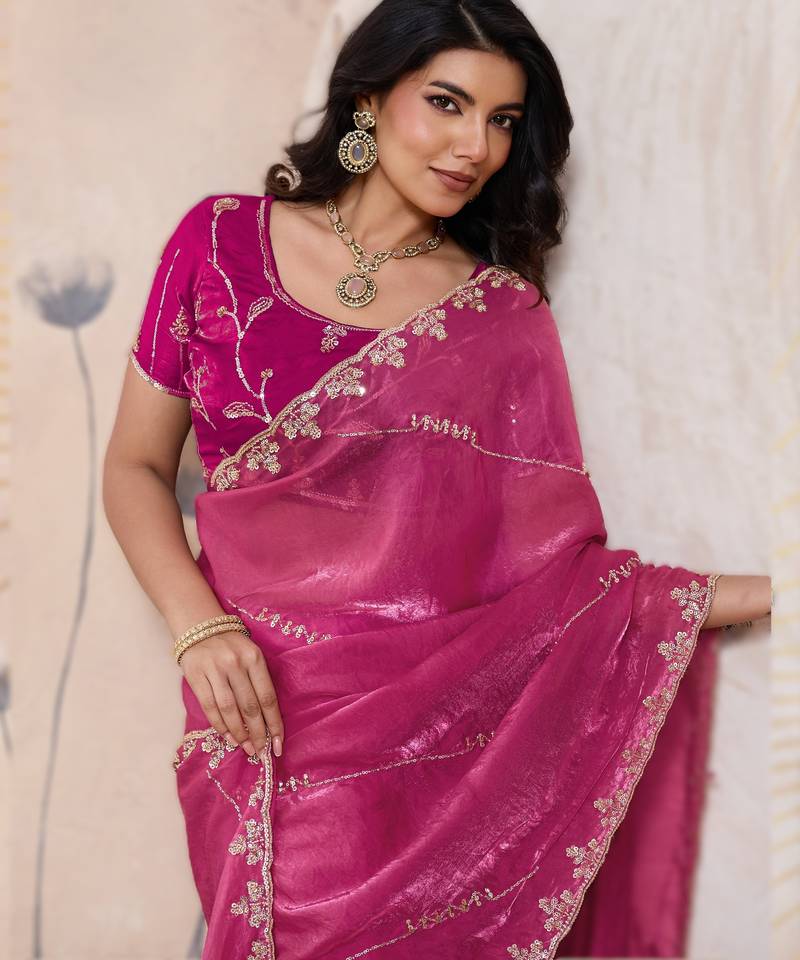Pink metallic velvet satin saree with cutdana, beads & zari work in emerald teal