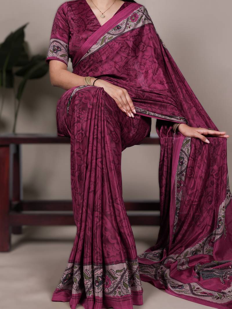 Pink printed crepe saree with matching blouse
