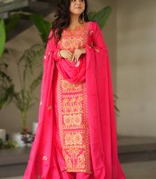Pink readymade chinnon silk embroidered kurta pant dupatta set stitched