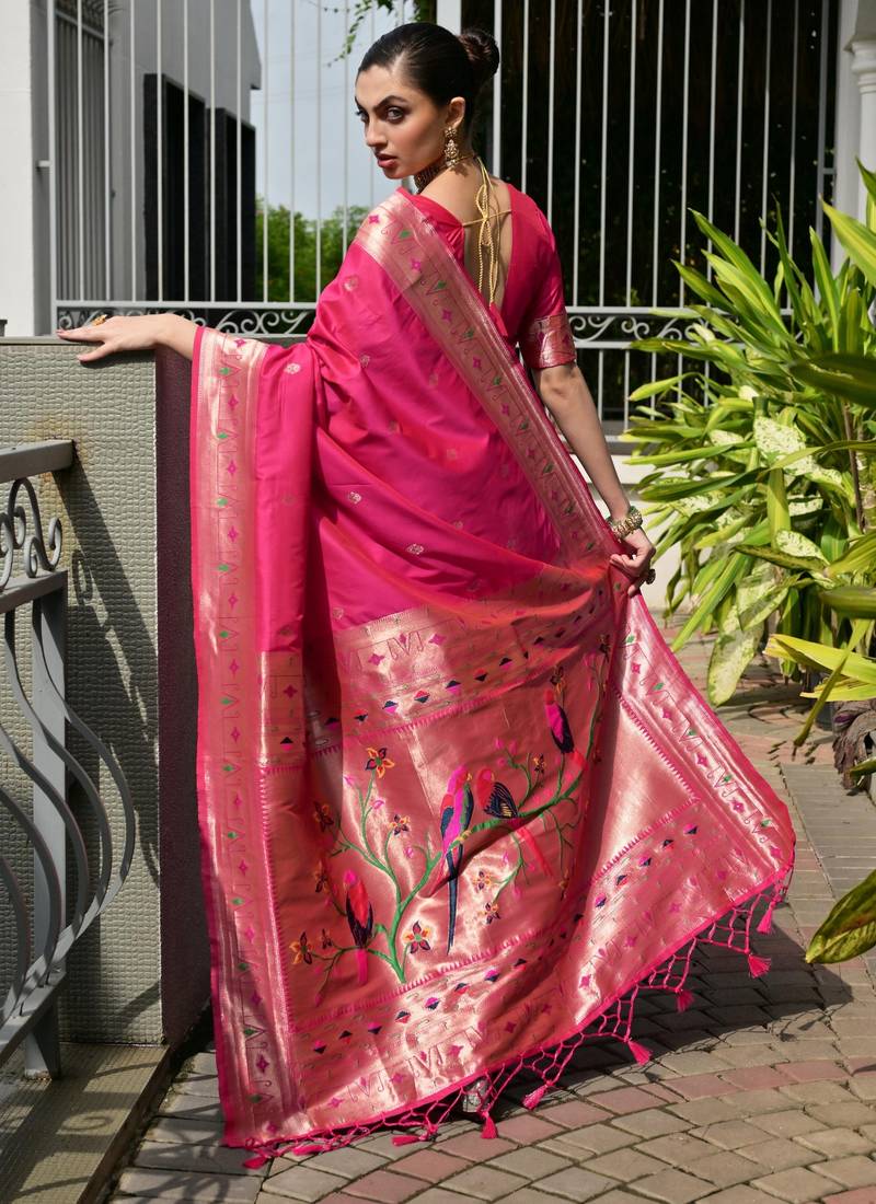 Pink soft banarasi silk paithani saree with rich zari & meena woven shiny pallu, zari butties & tassels
