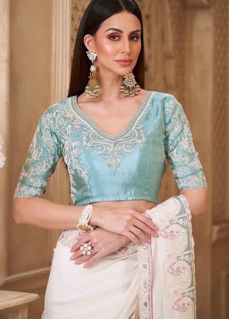 Product Name | Powder White Georgette Silk Saree With Satin Silk Blouse | |