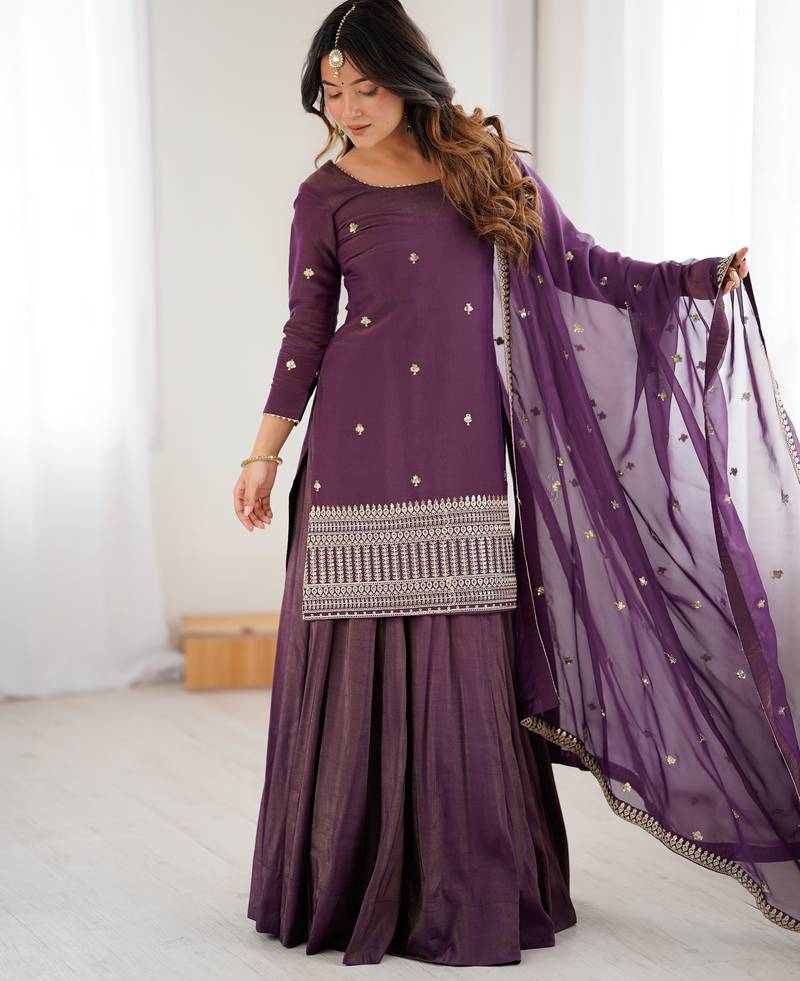 Premium roman shimmer chanderi silk kurta with flared lehenga & organza dupatta set stitched
