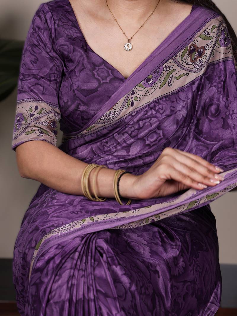 Pruple printed crepe saree with matching blouse