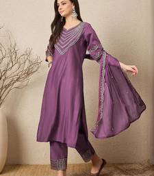 Purple elegant roman fabric embroidered kurti set with pure chinon dupatta – ready-made stitched suit