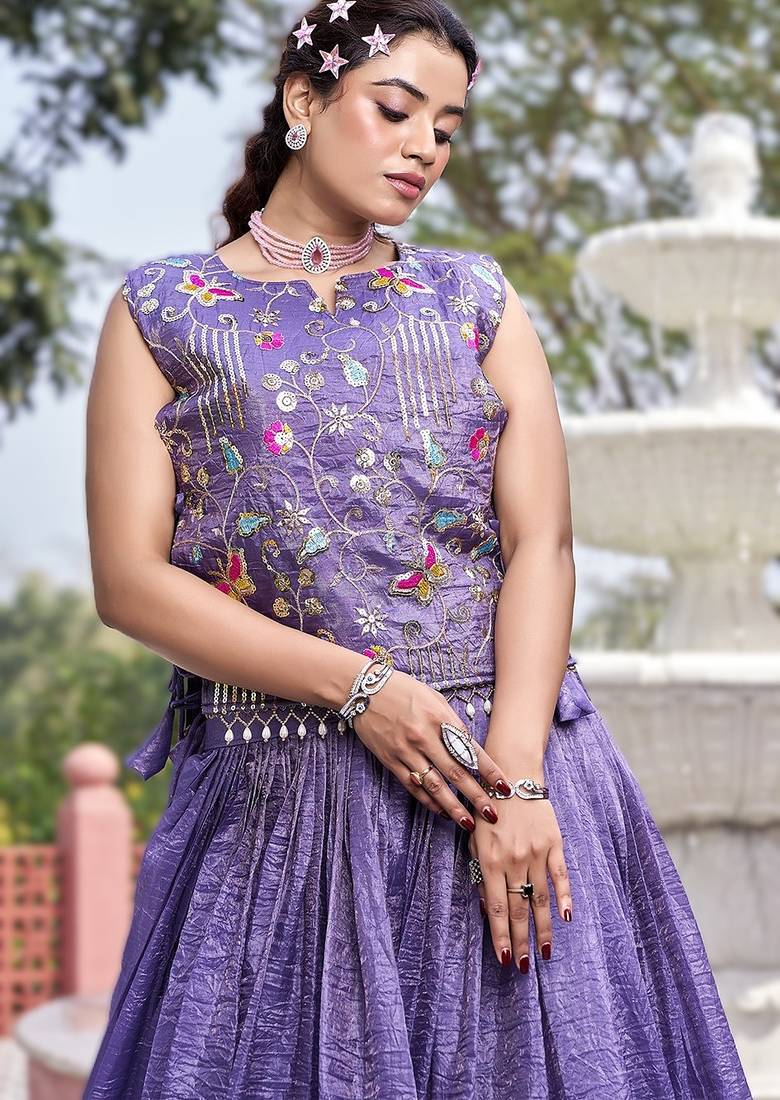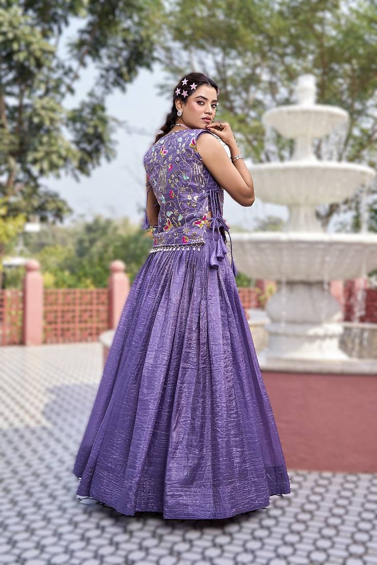 Traditional Purple Gold Crush Lehenga Choli With Detailed Embroidery On The Bodice Accompanied By A Matching Shrug And Voluminous Skirt. The Rich Gold Crush Texture And Decorative Thread Work On The Top Create An Eye Catching Ethnic Silhouette That Suits Weddings, Festivals, And Cultural Events. The Coordinated Pieces Ensure A Cohesive Look, While The Flare Of The Skirt Adds Volume And Flow. Designed For Both Style And Ease Of Wear, The Lehenga Blends Classic Design With Modern Tailoring.