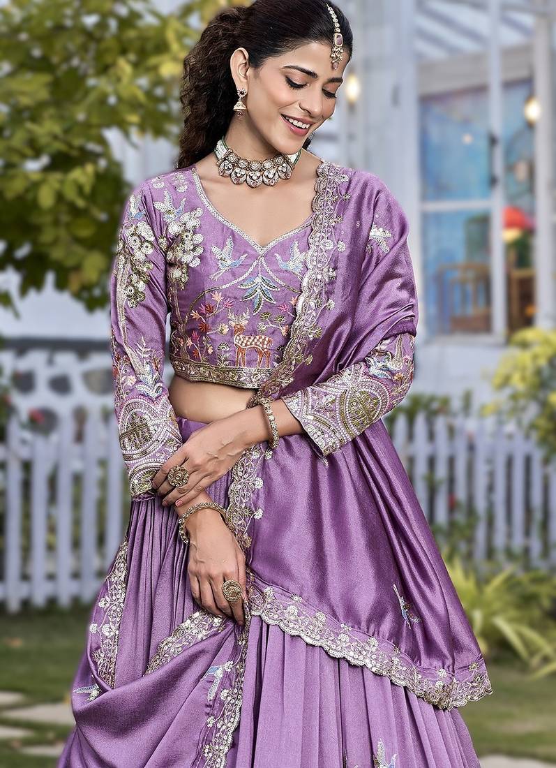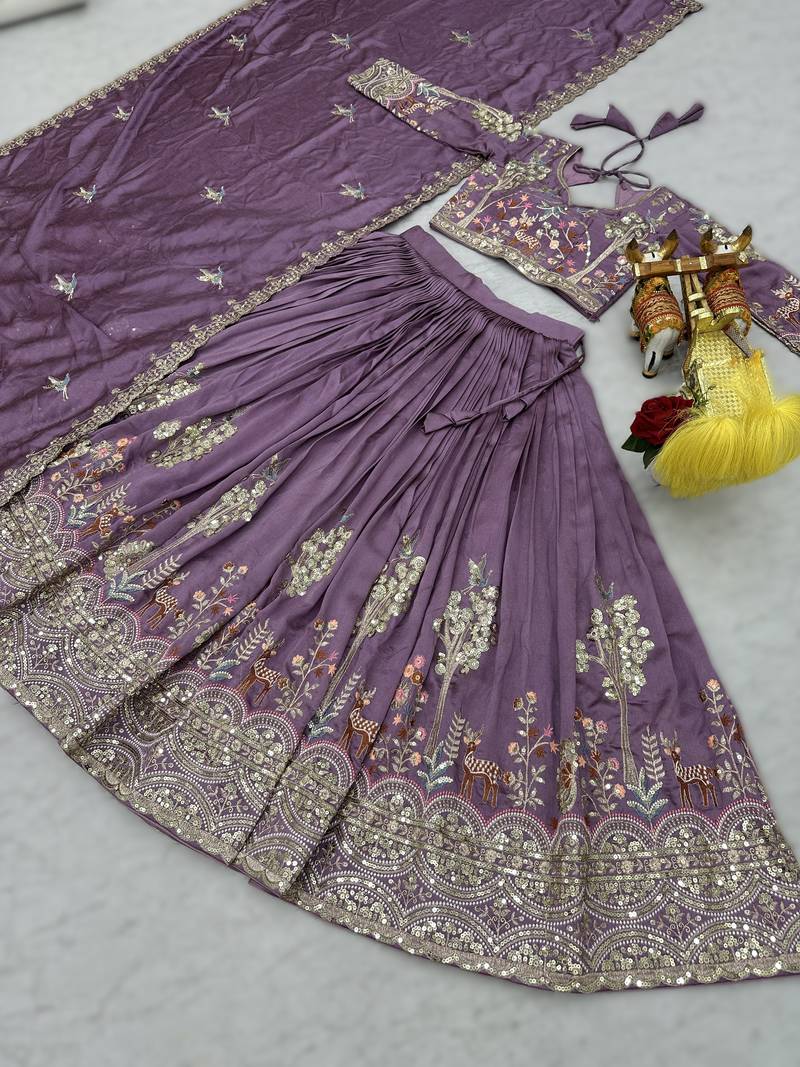 | Product Description | Coordinated Ethnic Set Including A Purple Vichitra Silk Lehenga With Embroidered Floral And Motif Detailing, Paired With A Matching Embroidered Blouse Showcasing The Same Decorative Threadwork. A Purple Sheer Dupatta With An Embroidered Border Completes The Three Piece Ensemble. The Lehenga Flows With Gentle Pleats And Detailed Hem Embroidery, While The Blouse’s Fitted Design And Full Sleeve Embroidery Tie The Look Together. The Dupatta Adds Layered Softness And Symmetry To The Set’s Overall Aesthetic. |