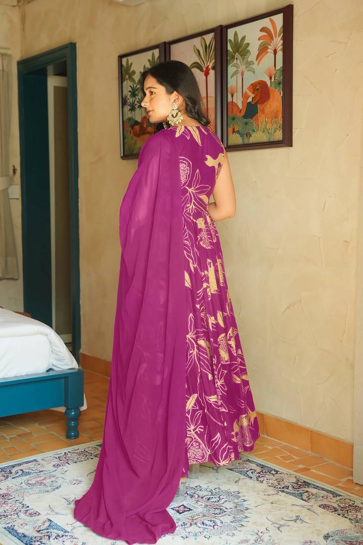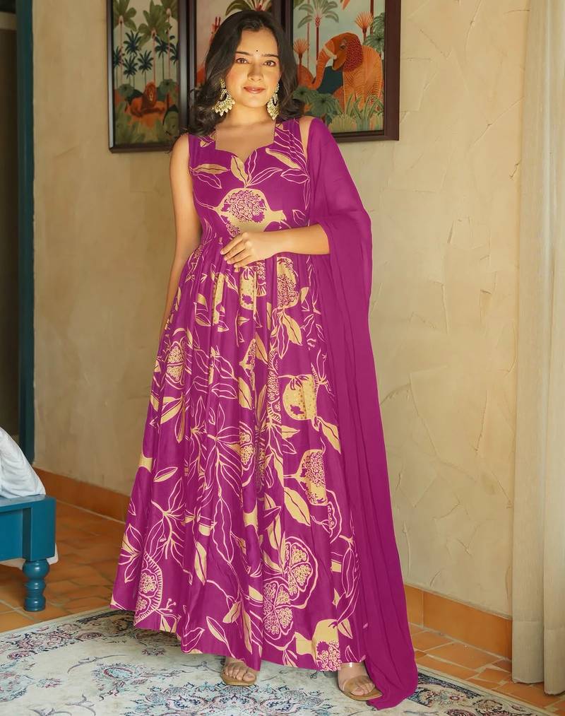 Rani pink heavy rayon digital printed anarkali gown with georgette dupatta & half inner