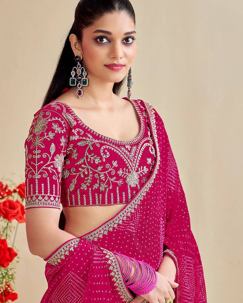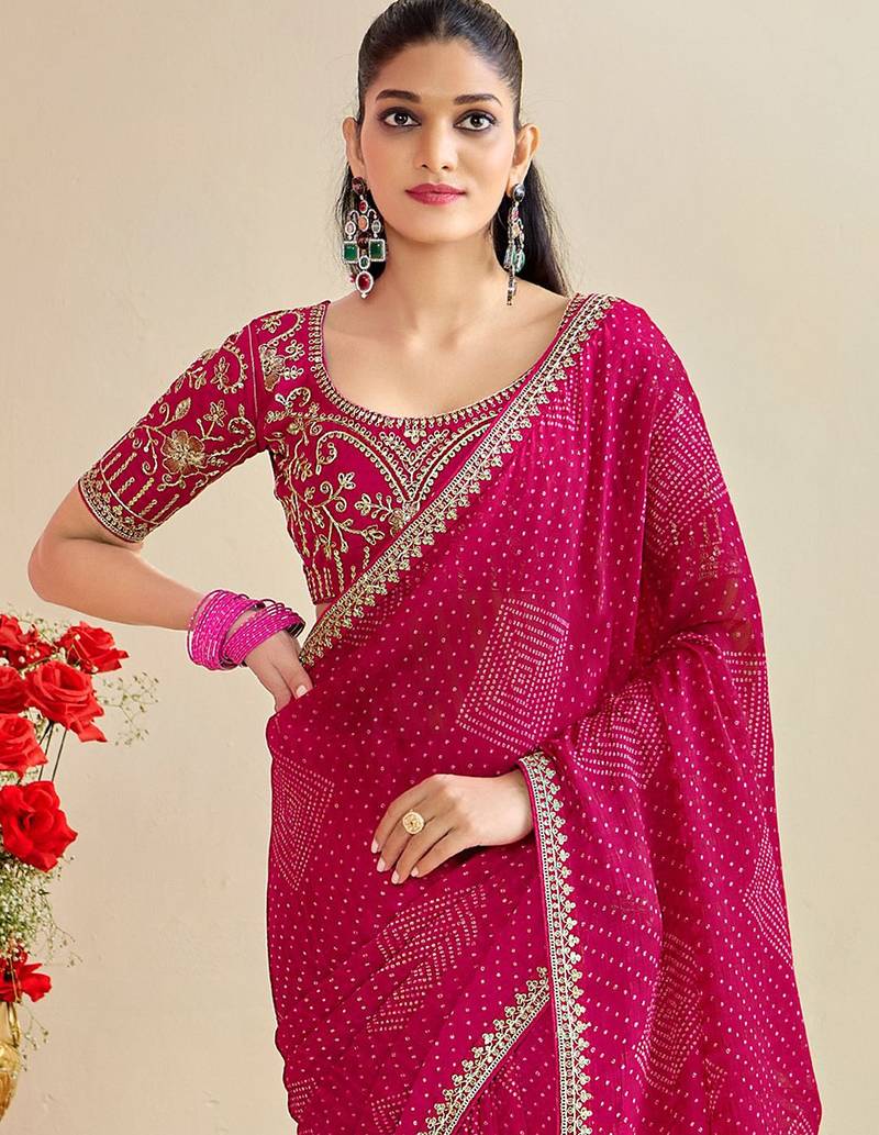 Rani pink moss chiffon silk blend bandhani printed saree with embroidered lace boarder with blouse