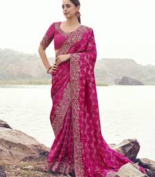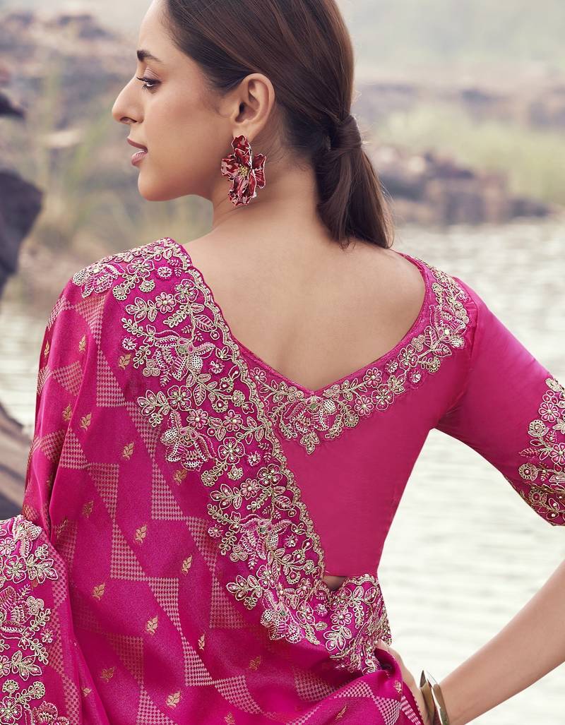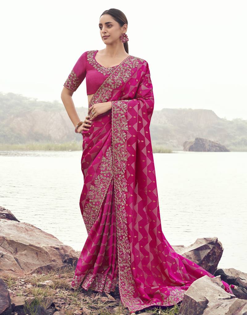 Rani pink pure satin silk blend jacquard saree with satin silk blend blouse luxury bridal saree