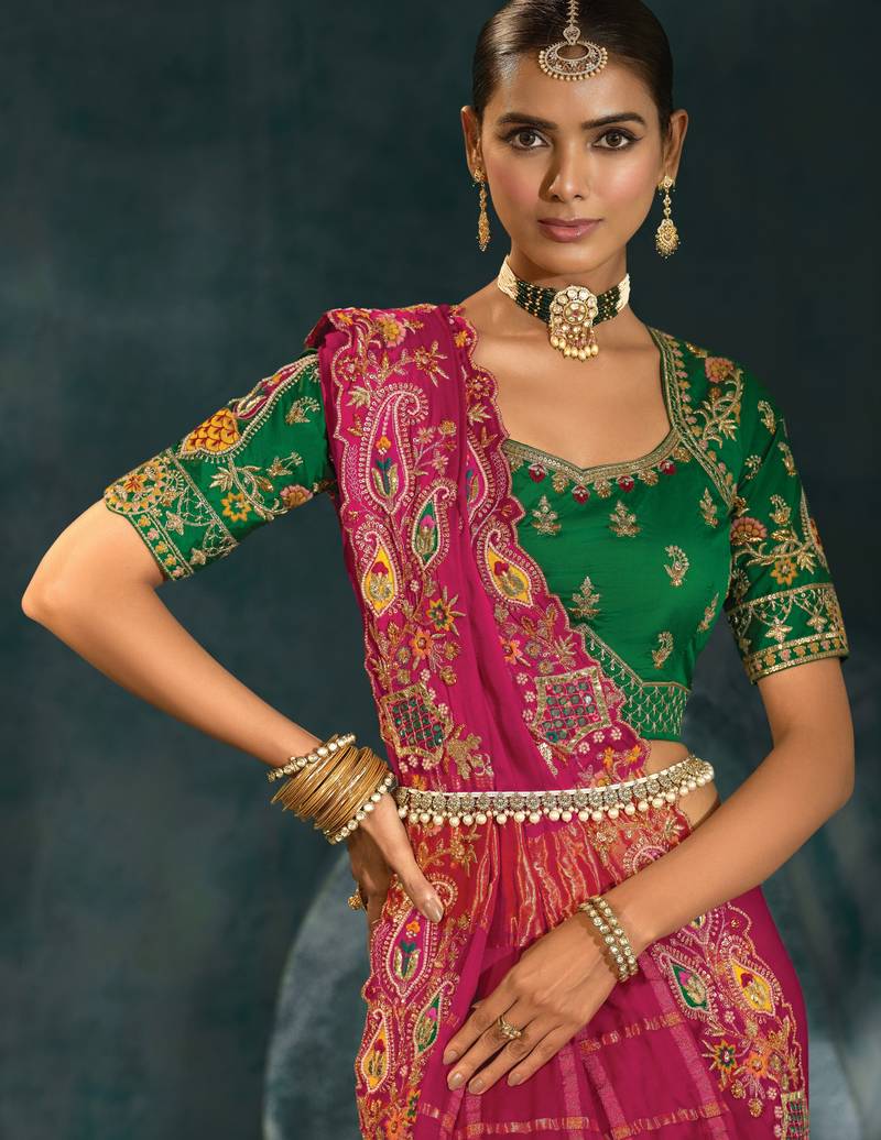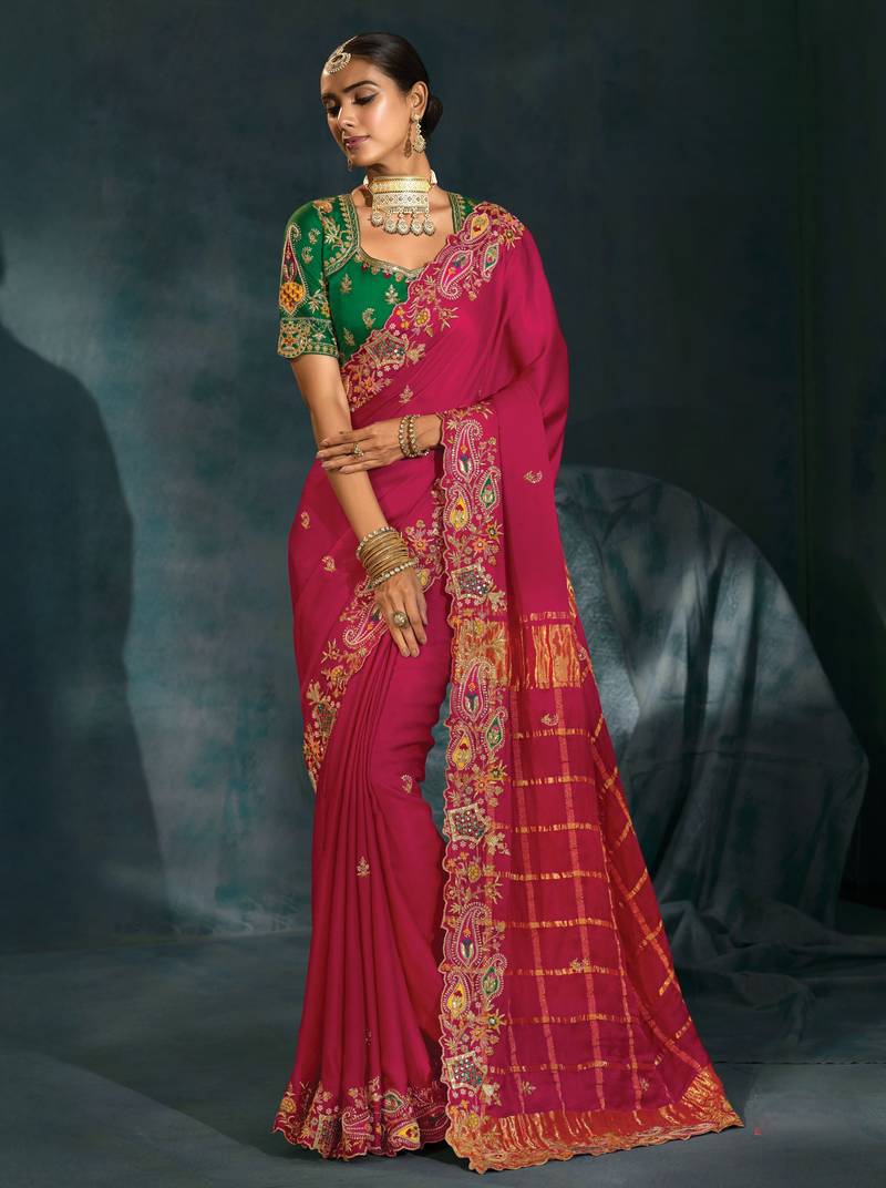 | Product Description | A Statement Piece In Vibrant Rani Shade, This Pure Gajji Silk Saree Features Exquisite Jari, Thread, Moti, Cut Dana, And Mirror Work. The Combination Of Traditional Craftsmanship And Luxurious Texture Makes It Ideal For Festive And Bridal Occasions. Paired With A Pure Silk Blouse For A Regal Finish. |