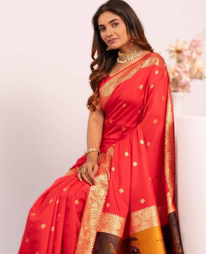 | Product Name | Red Extraordinary Banarasi Silk Saree With Resham Peacock Pallu | |