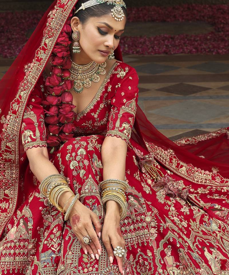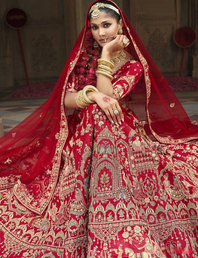 Red premium silk bridal lehenga with hand embroidery & zarkan work for wedding