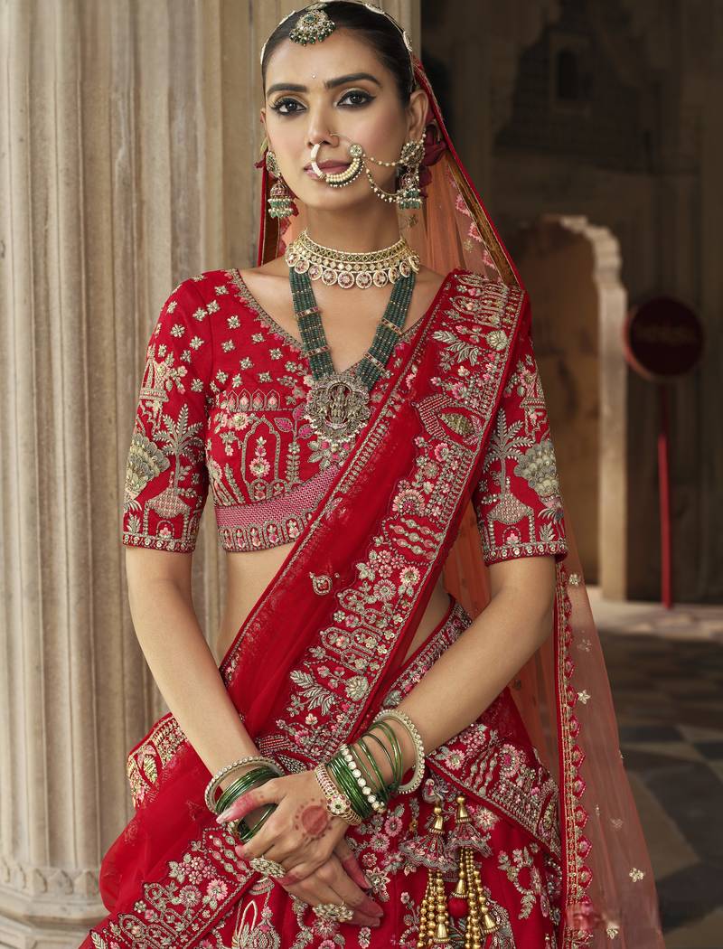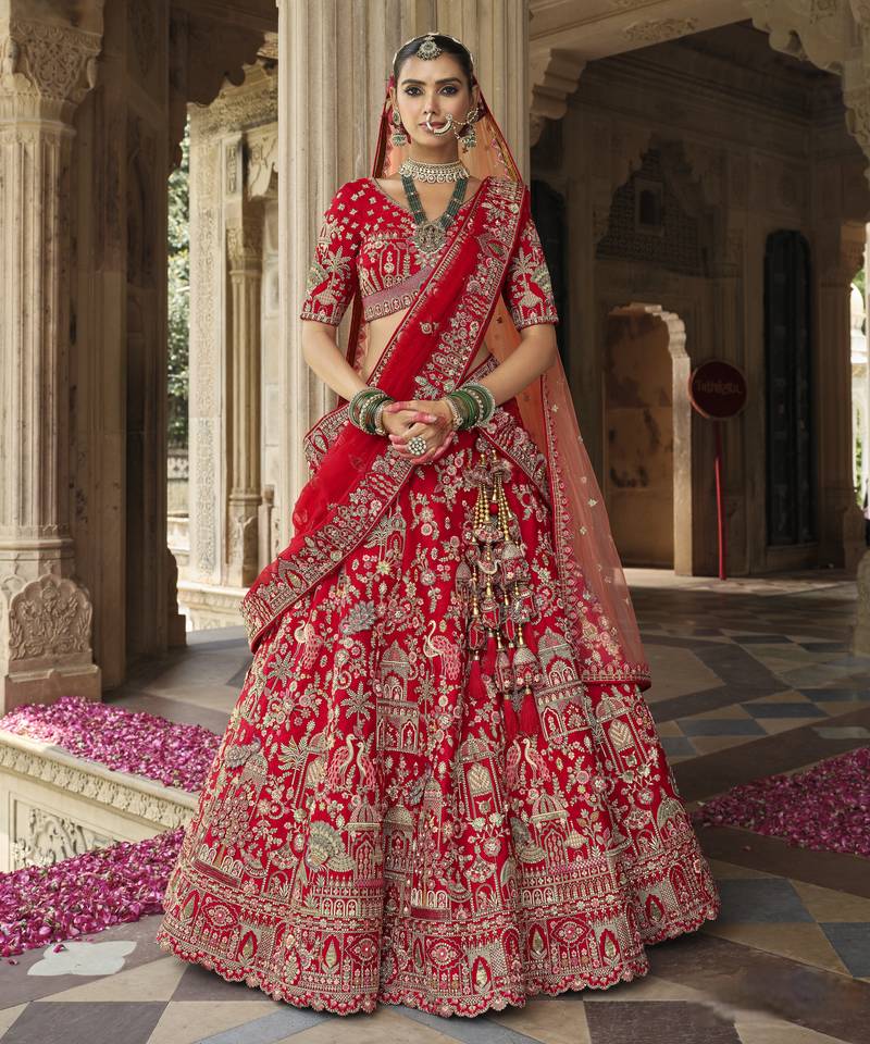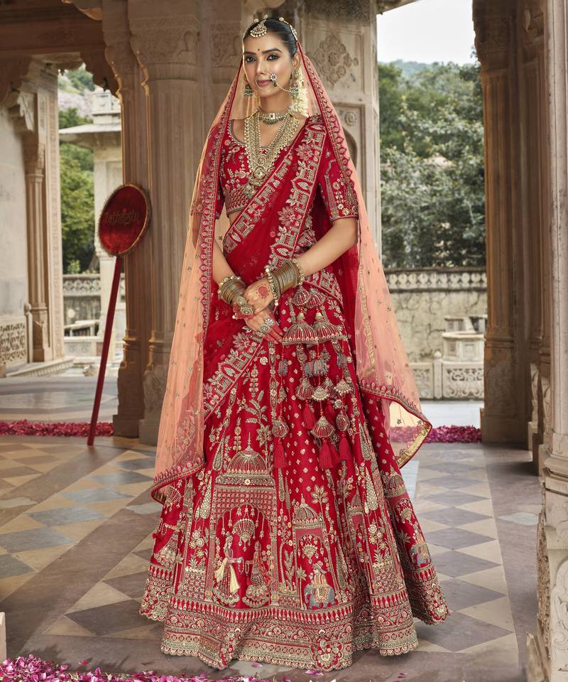 Red premium silk bridal lehenga with hand embroidery & zarkan work for wedding