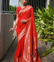 Red soft banarasi silk paithani saree with rich zari & meena woven shiny pallu, zari butties & tassels