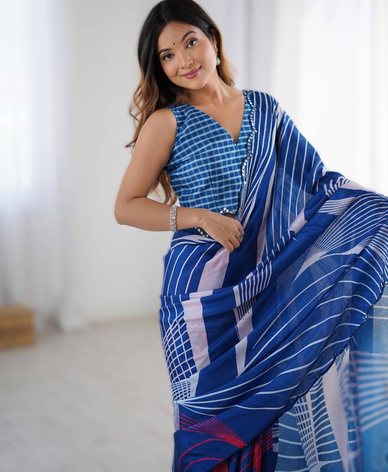 Royal blue heavy chinon printed saree with pape mirror work & mirror border | designer party & wedding wear saree