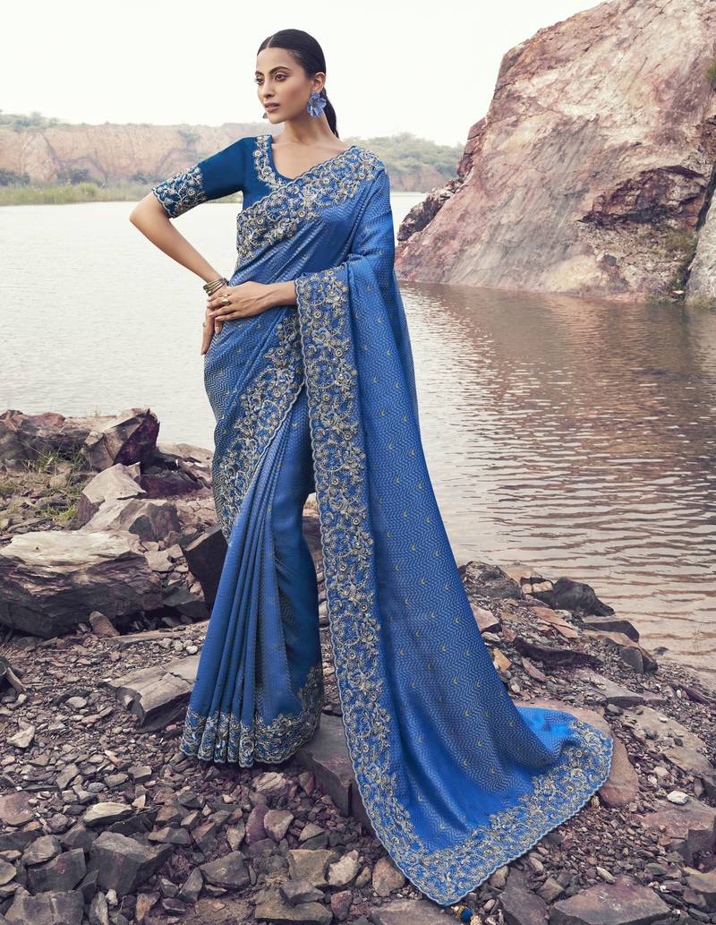 Royal blue pure satin silk blend jacquard saree with matching satin blouse designer wedding saree