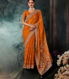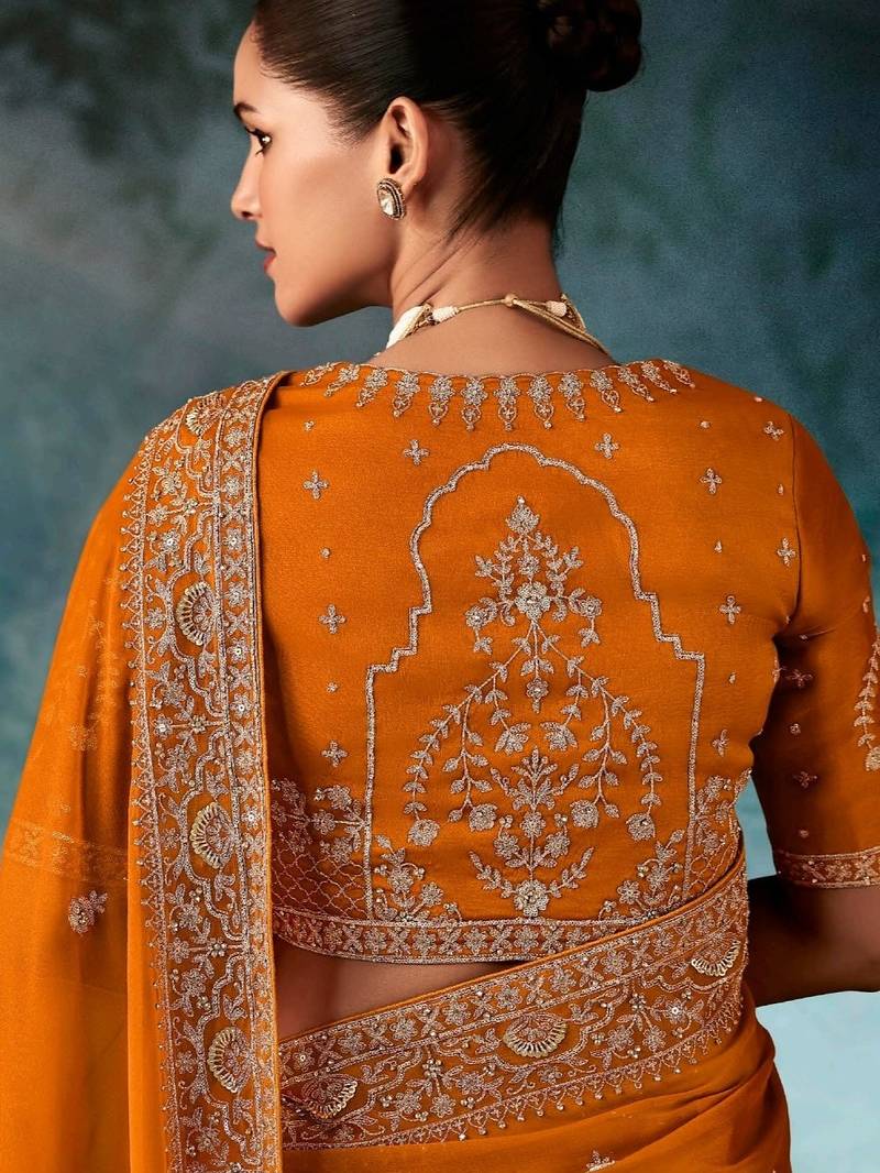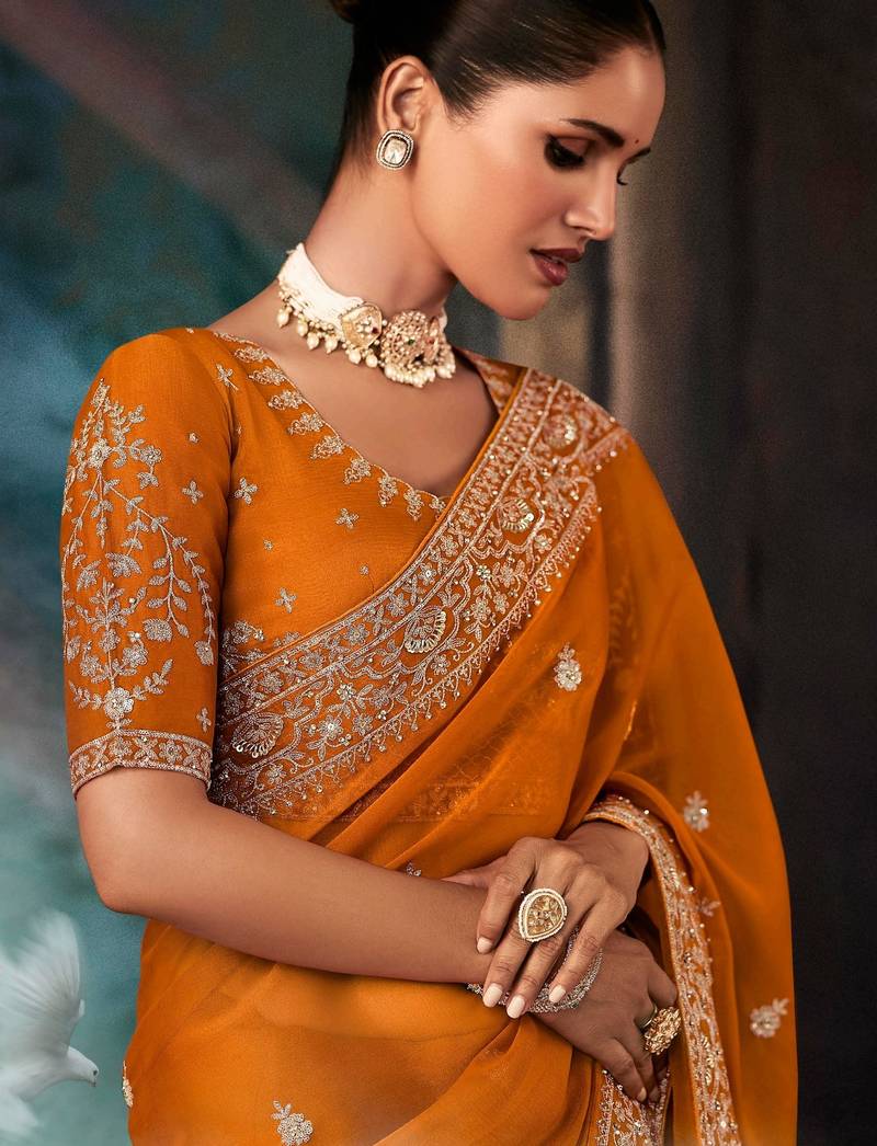 Rust luxury bridal saree for wedding | fancy fabric saree with hand embroidery & designer blouse