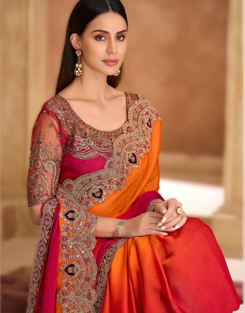 Saffron satin chiffon saree with banglori work blouse
