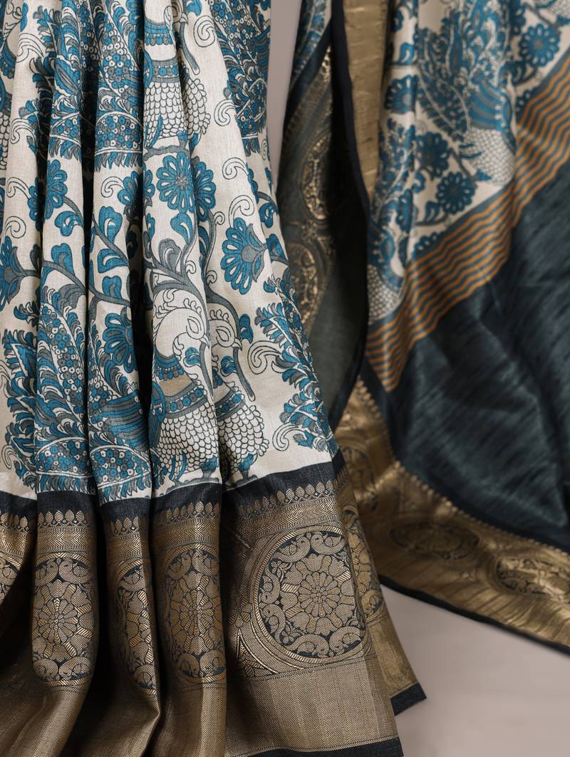 | Product Name | Sea Blue Printed Tasar Art Silk Saree With Shimmering Viscose Border | |