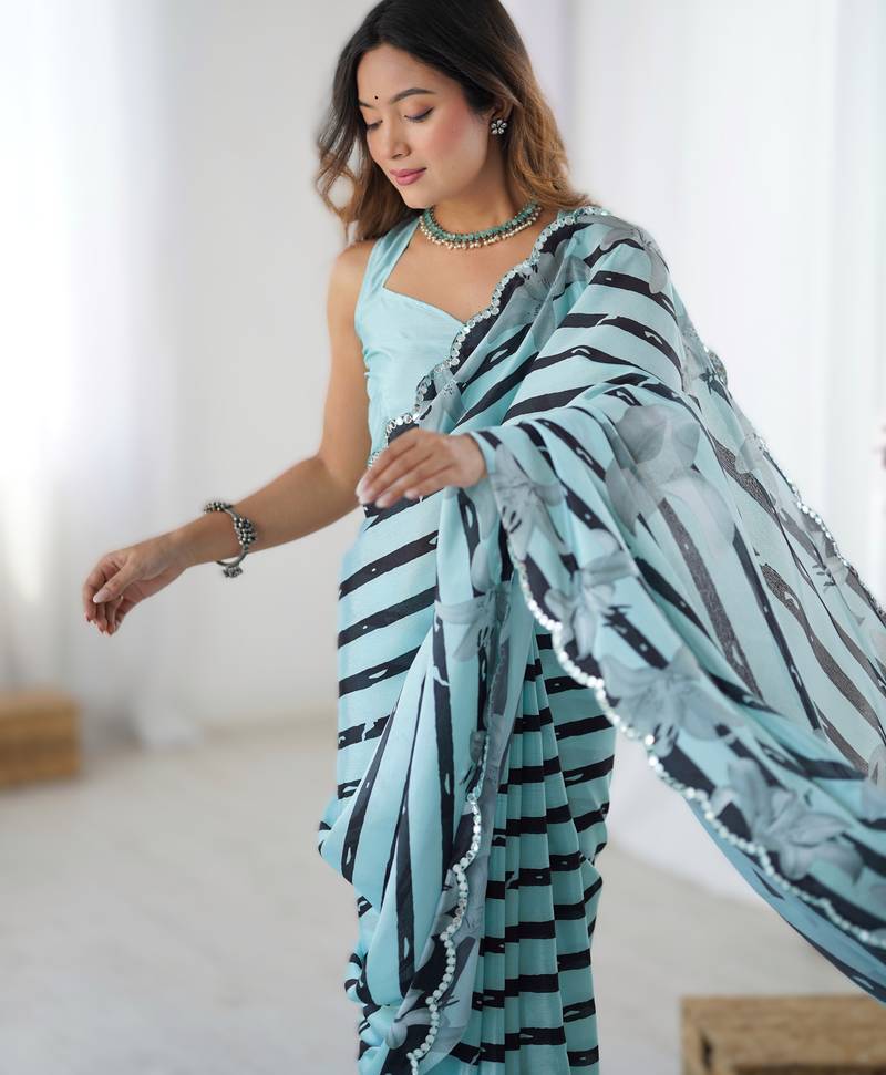 Sea green heavy chinon printed saree with pape mirror work & mirror border | designer party & wedding wear saree