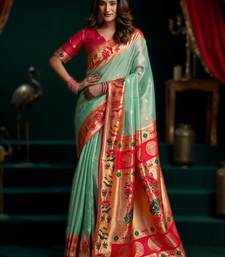 Sea green premium tissue paithani saree with lotus zari border & pum pum