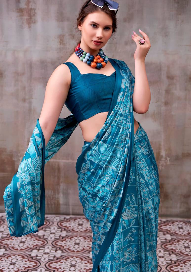 | Product Name | Sky Blue Elegant Floral & Geometric Printed Satin Silk Saree With Matching Blouse | |