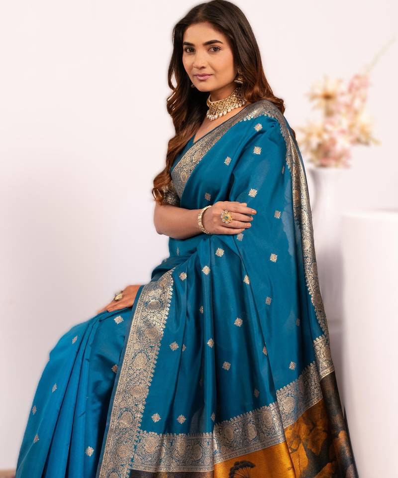 | Product Name | Sky Blue Extraordinary Banarasi Silk Saree With Resham Peacock Pallu | |