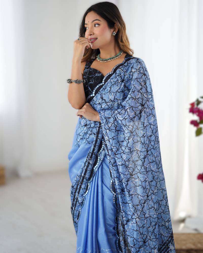 | Product Name | Sky Blue Heavy Chinon Printed Saree With Pape Mirror Work & Mirror Border | Designer Party & Wedding Wear Saree | |