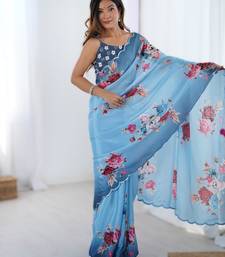 Sky blue heavy chinon printed saree with pape mirror work & mirror border | designer party & wedding wear saree