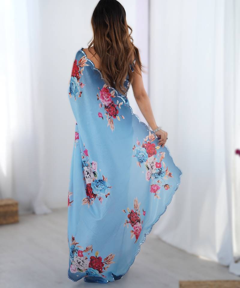 | Product Name | Sky Blue Heavy Chinon Printed Saree With Pape Mirror Work & Mirror Border | Designer Party & Wedding Wear Saree | |