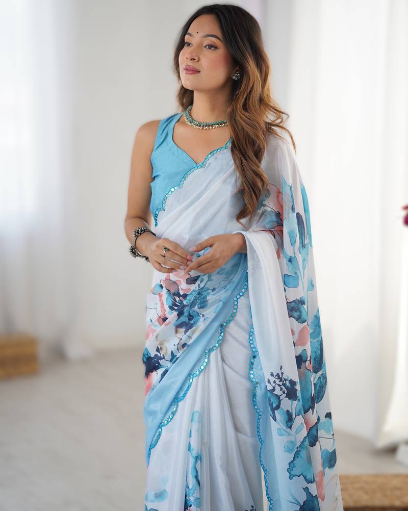 | Product Name | Sky Blue Heavy Chinon Printed Saree With Pape Mirror Work & Mirror Border | Designer Party & Wedding Wear Saree | |