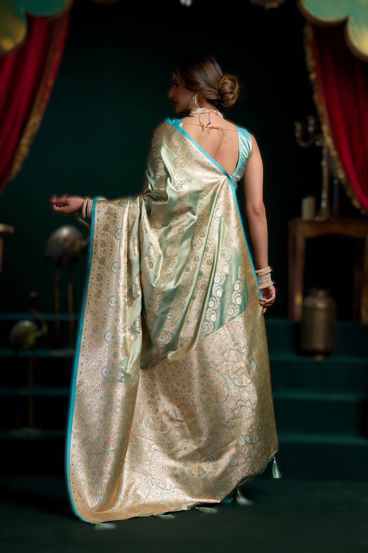 Sky blue premium satin silk saree with stylish pom-pom pallu