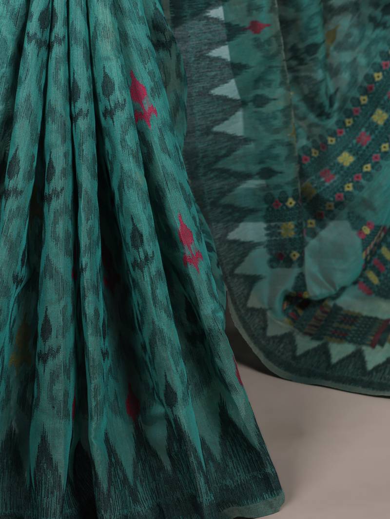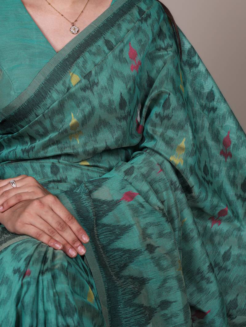 Teal blue poly cotton printed saree with thread weaving work