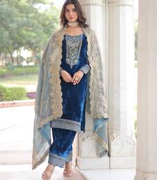 Teal color velvet sequins & zari embroidered readymade top–pant–dupatta set stitched
