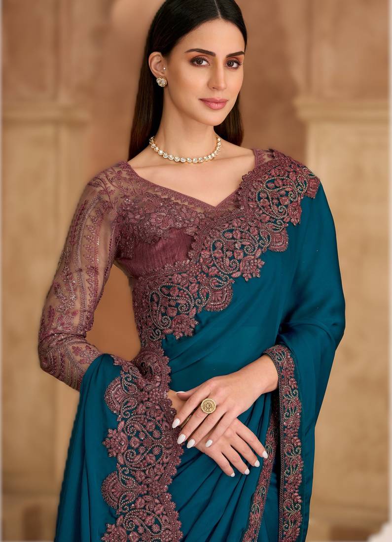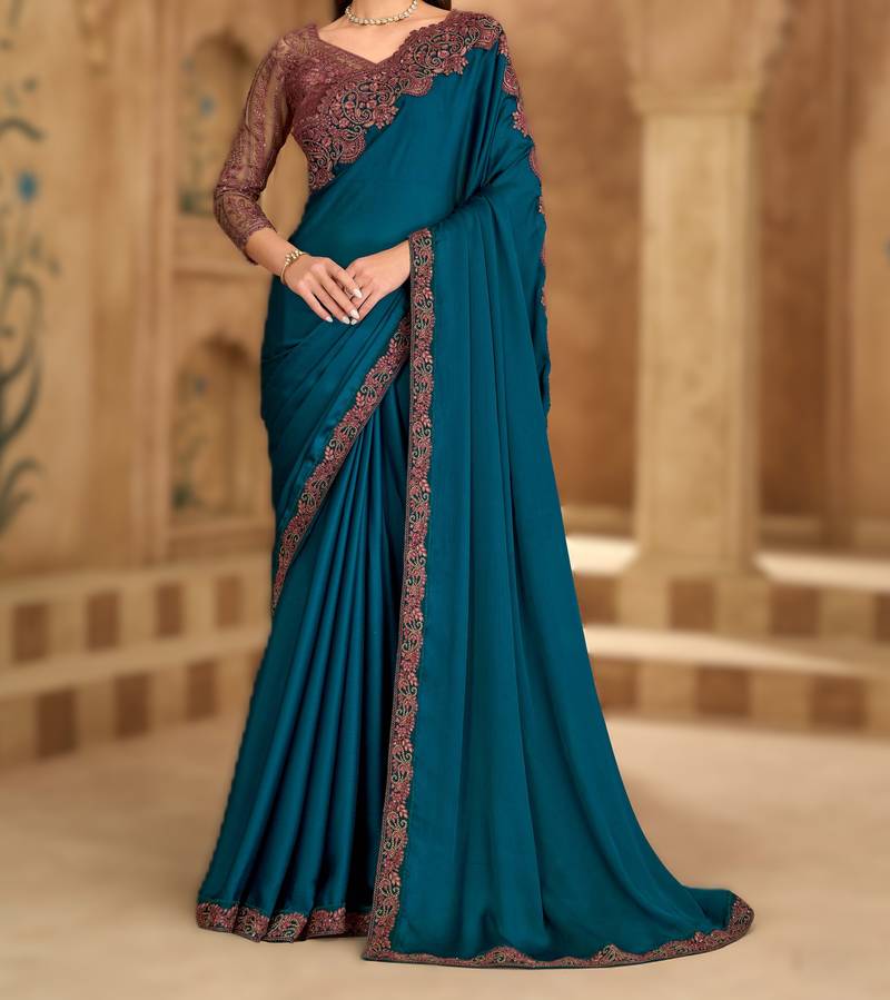 | Embellish | Stylish Teal Blue Satin Chiffon Saree Offering A Lightweight And Elegant Drape. Comes With A Matching Banglori Work Unstitched Blouse | |