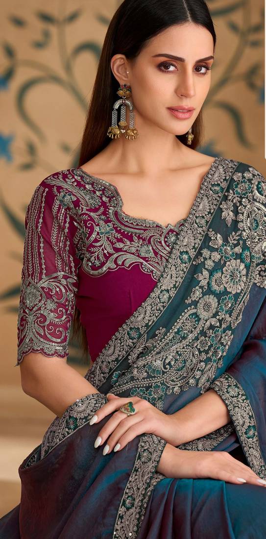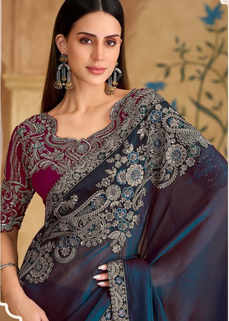 Twilight blue silk blend georgette saree with georgette work blouse