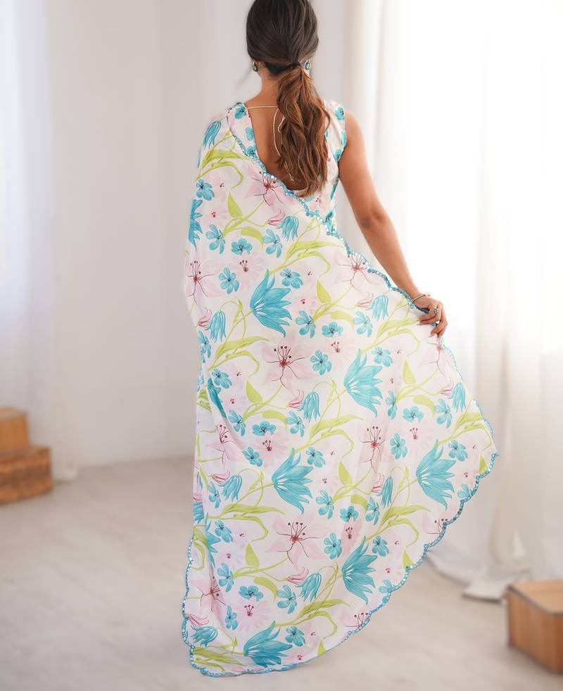 White heavy chinon printed saree with mirror work border