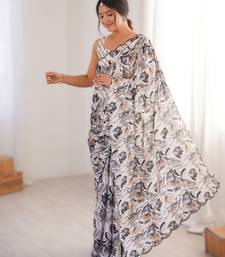 White heavy chinon printed saree with mirror work border