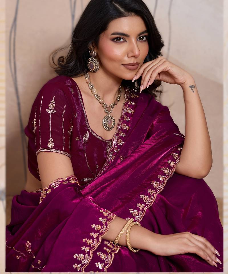 | Embellish | Crafted In Luxurious Metallic Velvet Satin, The Saree Features Intricate Cutdana, Beads, Sequins, And Zari Work Highlighted In A Graceful C Pallu Concept | |