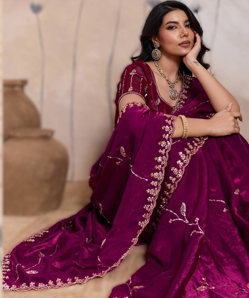 Wine metallic velvet satin saree with cutdana, beads & zari work in emerald teal