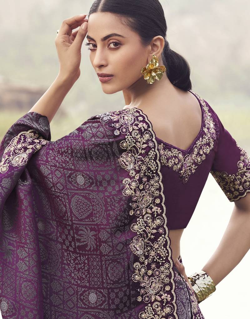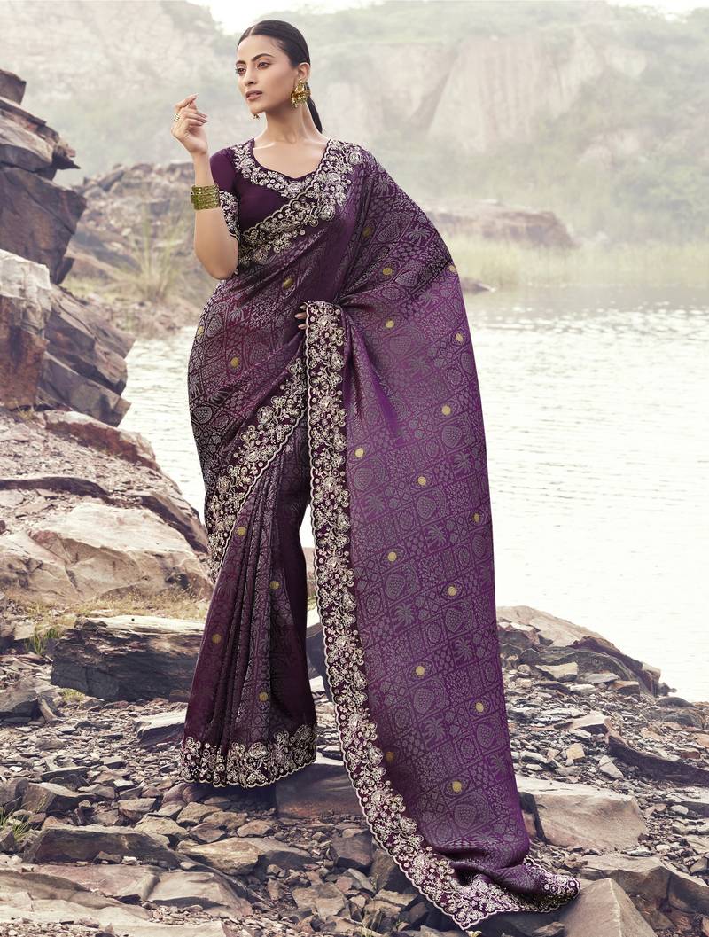 Wine pure satin silk blend jacquard saree with pure satin blouse premium wedding & party saree