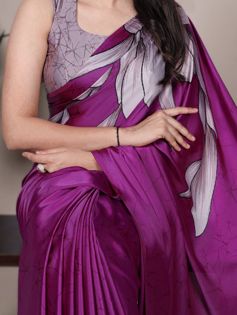 Wine satin art silk floral printed saree with matching blouse