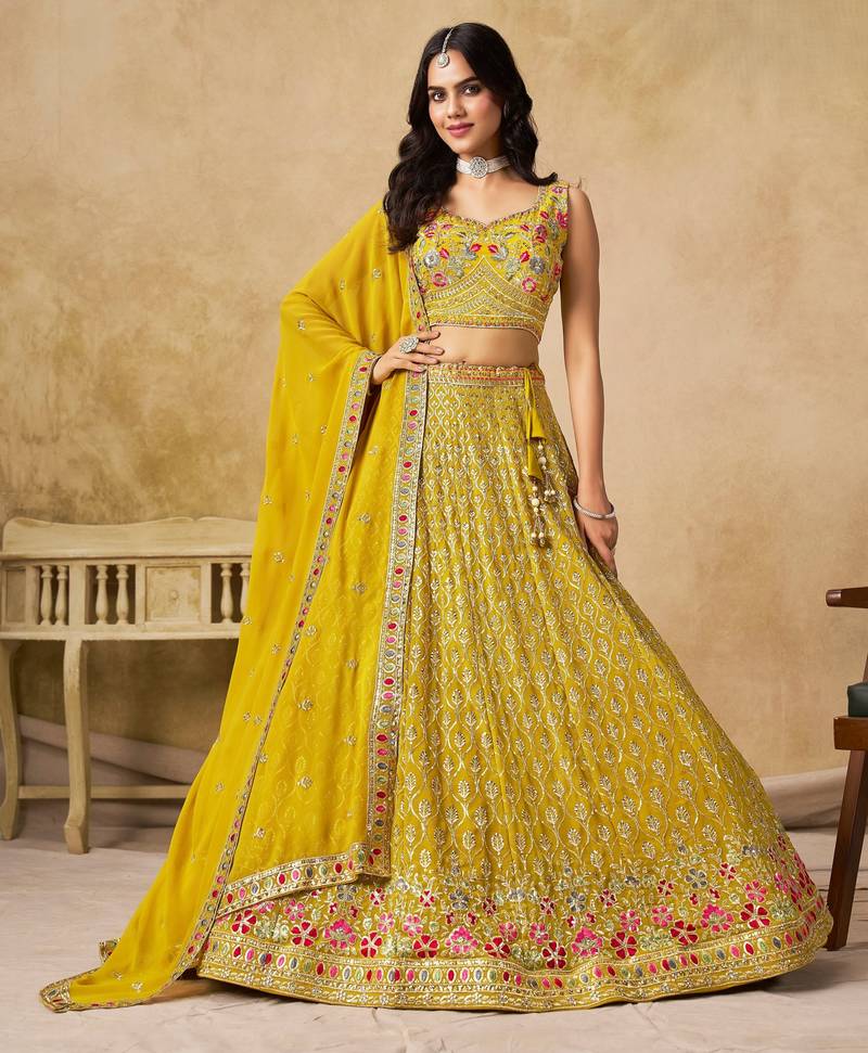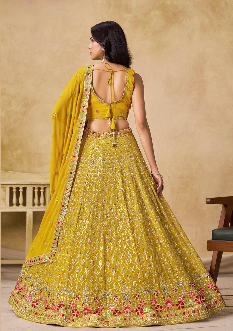 Yellow georgette sequins & thread embroidery lehenga choli with dupatta