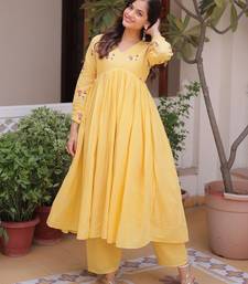 Yellow premium cotton embroidered kurti pant set for women stitched