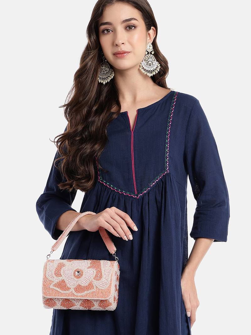 Product Description | The Anekaant Champagne Pink & Pearl White Clutch From The Blush & Bead Collection Is A Refined Blend Of Elegance And Detail. Designed In A Structured Rectangular Shape, It Features A Velvet Exterior With A Matching Lining. The Blush Base Is Accented With Off White And Champagne Tones. A Bold Floral Motif, Embroidered And Finished With Crystal Embellishments, Adds Artistic Flair. Secured With A Magnetic Button Closure, It Includes A Single Compartment, An Inner Slip Pocket, And A Detachable Embellished Handle, As Well As A Metal Chain For Versatile Styling.