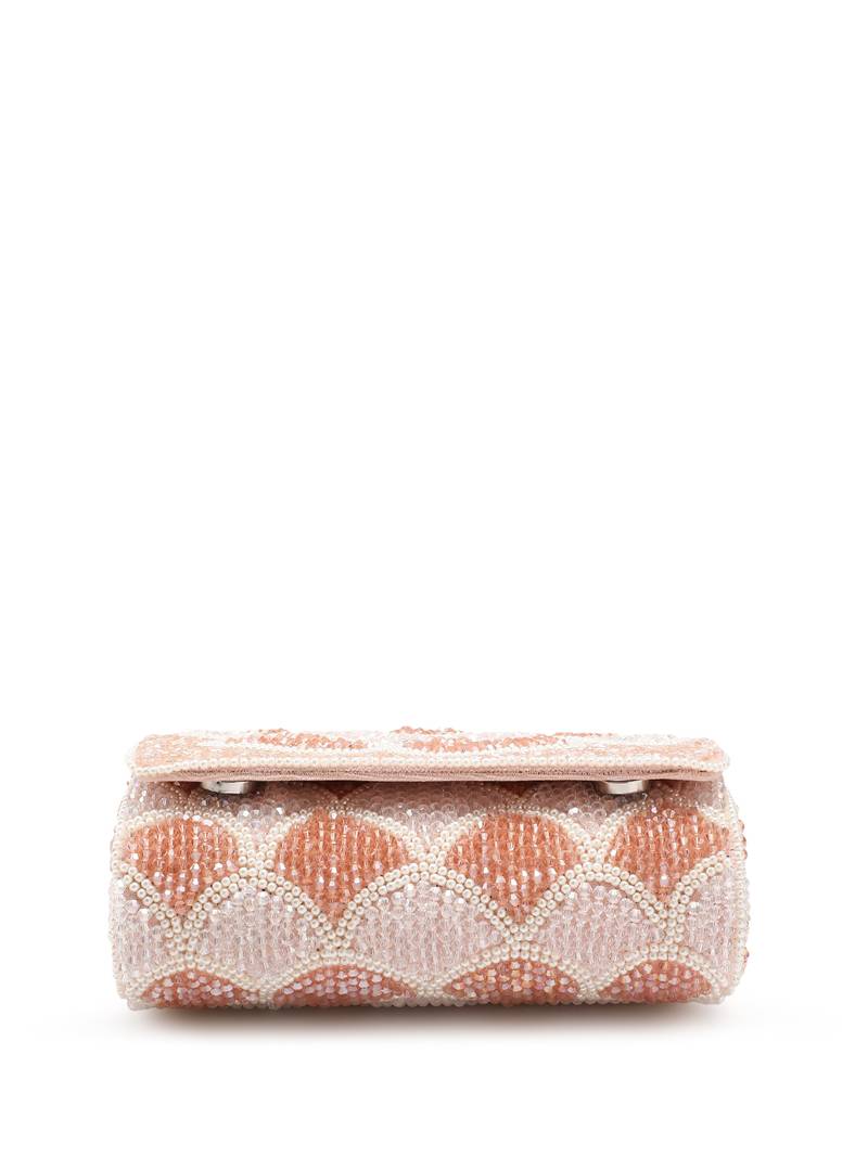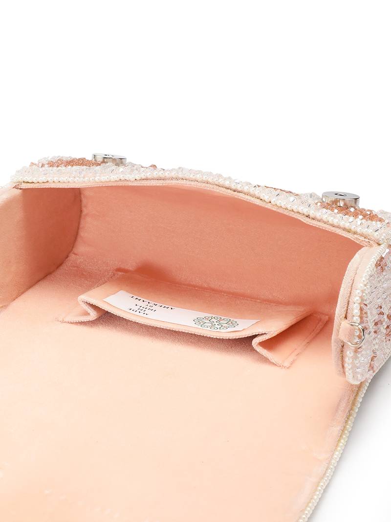 The Anekaant Champagne Pink & Pearl White Clutch From The Blush & Bead Collection Is A Refined Blend Of Elegance And Detail. Designed In A Structured Rectangular Shape, It Features A Velvet Exterior With A Matching Lining. The Blush Base Is Accented With Off White And Champagne Tones. A Bold Floral Motif, Embroidered And Finished With Crystal Embellishments, Adds Artistic Flair. Secured With A Magnetic Button Closure, It Includes A Single Compartment, An Inner Slip Pocket, And A Detachable Embellished Handle, As Well As A Metal Chain For Versatile Styling.