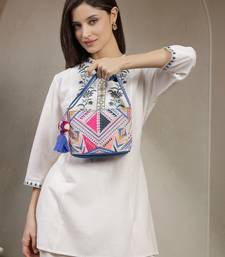| Product Description | This Anekaant Sling Bag From The Boho Collection Is Crafted From Cotton Jacquard In A Multicolor Palette Of Pink, Blue, Black, White, And Mustard. Designed With A Single Main Compartment Secured By A Zip Closure, It Features A Tribal Inspired Geometric Pattern Incorporating Chevrons, Triangles, And Diamond Motifs In Striking Contrasting Tones. The Interior Is Equipped With A Zip Pocket To Keep Valuables, While An Adjustable Sling Strap With A Matching Tassel Completes The Look. Dimensons (L X H X W) : 19 X 14 X 7 Cm. |