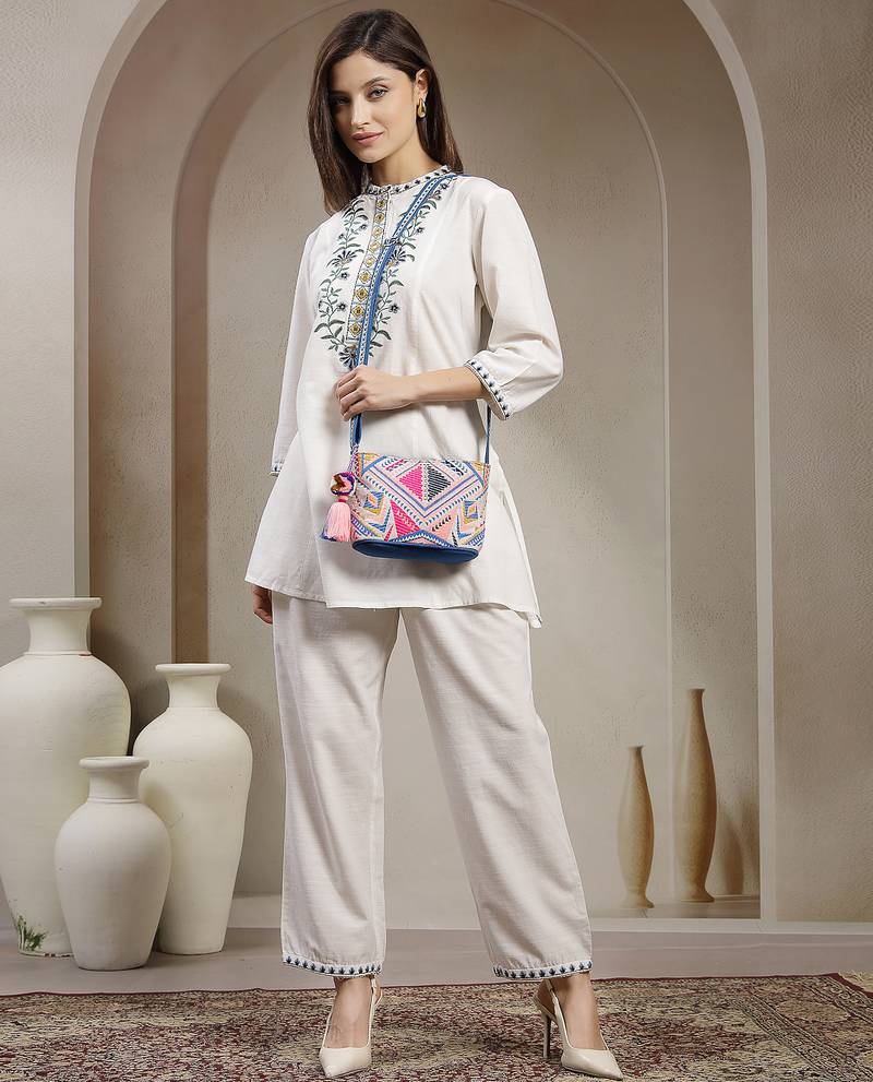 | Product Description | This Anekaant Sling Bag From The Boho Collection Is Crafted From Cotton Jacquard In A Multicolor Palette Of Pink, Blue, Black, White, And Mustard. Designed With A Single Main Compartment Secured By A Zip Closure, It Features A Tribal Inspired Geometric Pattern Incorporating Chevrons, Triangles, And Diamond Motifs In Striking Contrasting Tones. The Interior Is Equipped With A Zip Pocket To Keep Valuables, While An Adjustable Sling Strap With A Matching Tassel Completes The Look. Dimensons (L X H X W) : 19 X 14 X 7 Cm. Style : Boho Sling Bag Featuring A Single Main Compartment With A Secure Zip Closure.