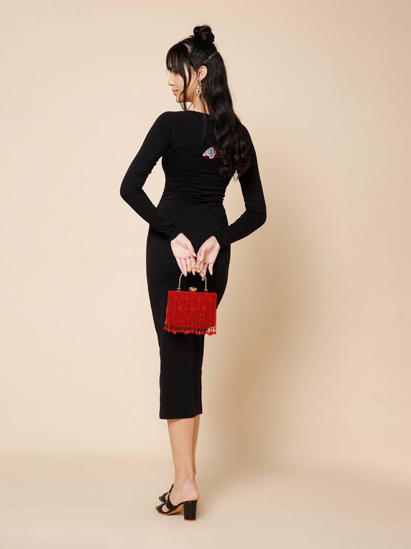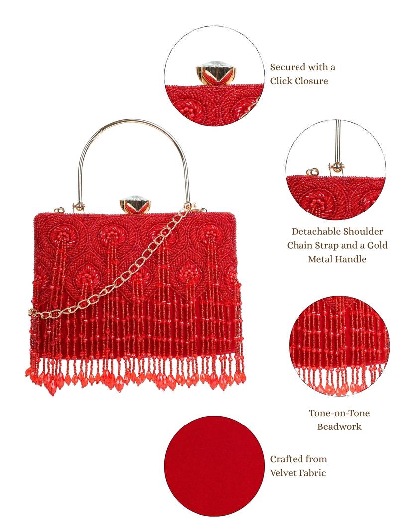 This Anekaant Clutch From The Crystal Cascade Collection Is A Timeless Statement Piece. Designed In Deep Crimson Red With Tone On Tone Bead And Sequin Embellishments, It Is Finished With A Gold Handle And Crystal Clasp. Crafted On A Velvet Base, It Features Concentric Teardrop Bead Embroidery Enhanced With Cascading Fringe For Graceful Movement.It Includes A Spacious Compartment With A Secure Click Closure And Comes With A Detachable Shoulder Strap And Gold Handle For Versatile Styling. Dimensions (L X H X W): 18 X 13 X 7 Cm